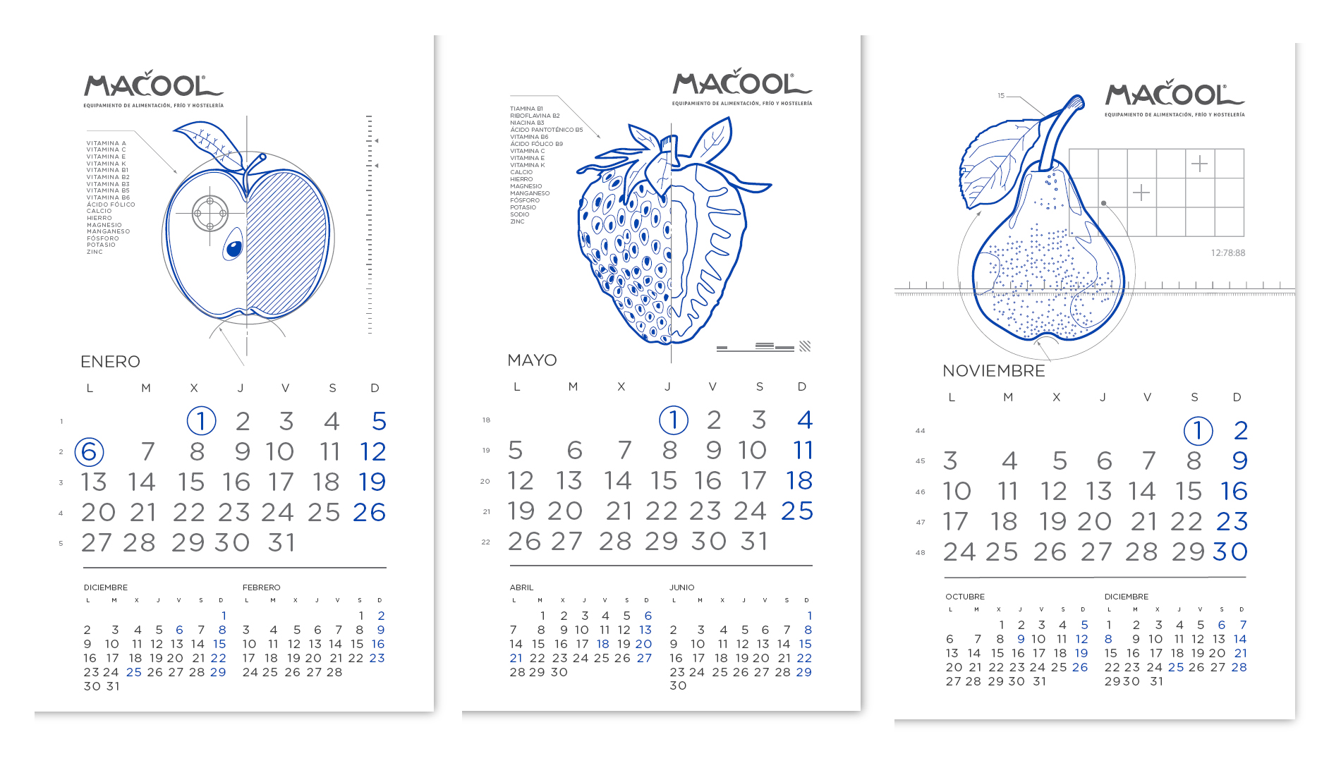 Cada uno de los meses posee una ilustración de una fruta de temporada resuelta con estética de dibujo técnico.
