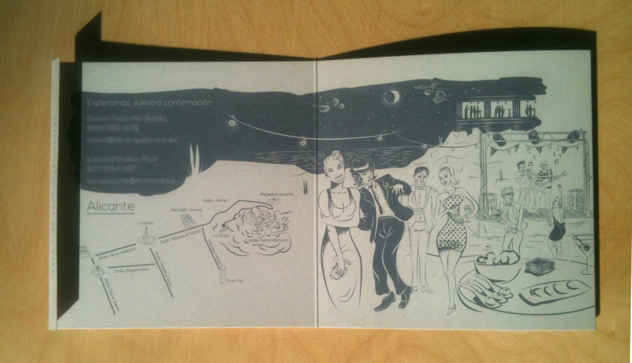 En el interior subimos el color contrastando el visón claro y un gris marengo con la intención de potenciar el juego dentro/fuera. La ilustración describe el tipo de ambiente que habrá en la boda sin palabras. Resuelve una preocupación de los novios y potencia para el invitado el aspecto lúdico.