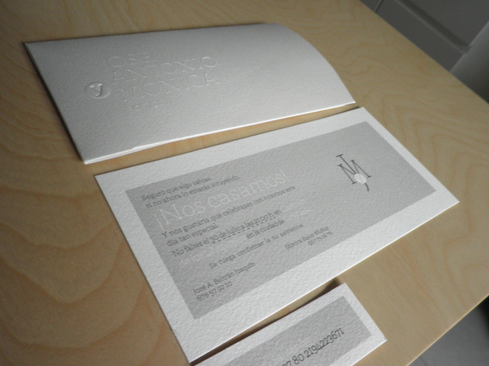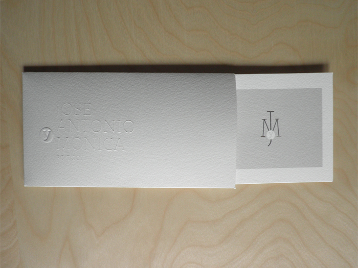 A la hora de realizar este tarjetón de boda decidimos basarnos en la mínima expresión. Se creó un sobre contenedor con un golpe seco en la portada.